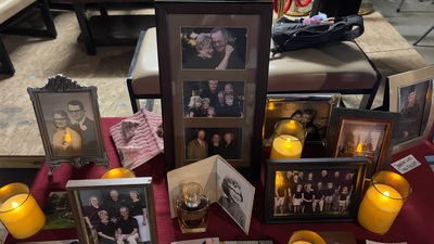 The author holds the copyright to these images and the creation of the presentation. The author may not hold the copyright to images or other work used within the presentation which was used under the educational and fair use exceptions. Alt Text for images: Image 01: A memorial display with family photos, candles, a Dior perfume bottle, and a model house on a red-clothed table. Image 02: A display of family photographs, a diploma, and candles on a red cloth.