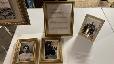 ***Note: There are additional images that correspond to this presentation. They can be found under additional files below*** Image Descriptions: Image 01: The image displays a collection of framed photographs and a text document arranged on a white table. In the center, a large gold-framed document features a neatly printed text. To its left, a medium-sized portrait of an older woman with short, dark hair and a high-collared blouse also in a gold frame. Below this, another framed photograph shows a man and woman standing together in an outdoor setting. To the right of the text document is a gold-framed, sepia-toned family portrait of six individuals, likely from an earlier time period, with the adults seated and children gathered around them. A small card labeled "Timeline for Bertha Heiken (Link)" is placed near the bottom right corner of the table. Image 02: The image features four framed items arranged on a flat surface. In the top center, there is a gold-framed document containing printed text. Below this, two smaller gold-framed black and white photographs are displayed. On the left, a portrait of a woman wearing a white blouse. To the right, a photograph shows an older man and woman standing side by side in an outdoor setting. On the right side of the image, slightly above the bottom photographs, is another framed black and white photograph featuring six children in formal attire. Below this is a handwritten index card with text.